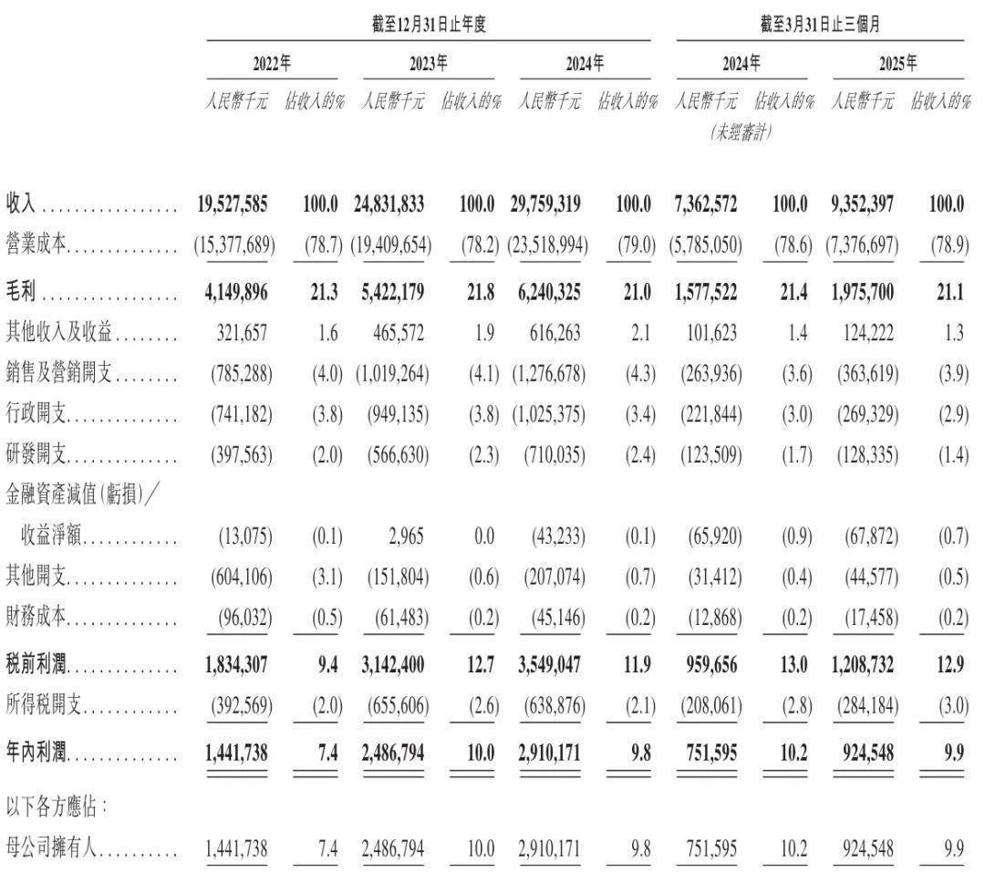 招股书显示,奥克斯2022年、2023年、2024年营收分别为195.28亿元、248.32亿元、297.59亿元;毛利分别为41.5亿元、54.22亿元、62.4亿元;毛利率分别为21.3%、21.8%、21%;期内利润分别为14.42亿元、24.87亿元、29.1亿元;期内利润率分别为7.4%、10%、9.8%。