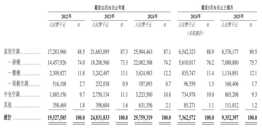 奥克斯的主要收入来自家用空调,其中,2025年前3个月来自家用空调的收入83.76亿,占比89.5%,家用空调中收入最大的是挂机,贡献收入70.8亿元,占营收比例75.7%;来自柜机收入11.35亿,占营收比例为12.1%。