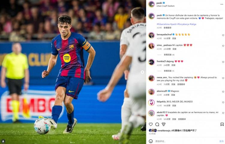本场比赛佩德里首发出战并佩戴队长袖标,赛后他在社媒晒照纪念写道:“再次戴上队长袖标是一份荣耀,也用一场漂亮的胜利在克鲁伊夫球场留下美好回忆。全队都做得不错!”