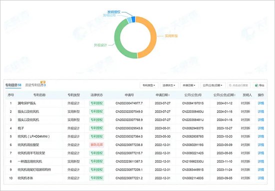 比如,徕芬曾公开4年投入1亿元用于研发,但天眼查App显示,深圳术叶创新科技有限公司及东莞市徕芬电子科技有限公司累计公开267项专利,但核心技术发明专利仅31项,占比仅约12%,其余多为外观设计及实用新型专利。
